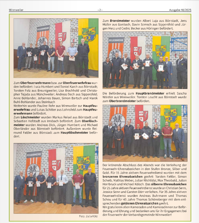 28.11.2025 - Grund zur Freude: Am Freitag, 28. November 2025, berichtet die Winnweiler Rundschau über weiter Beförderungen bei der Feuerwehr.