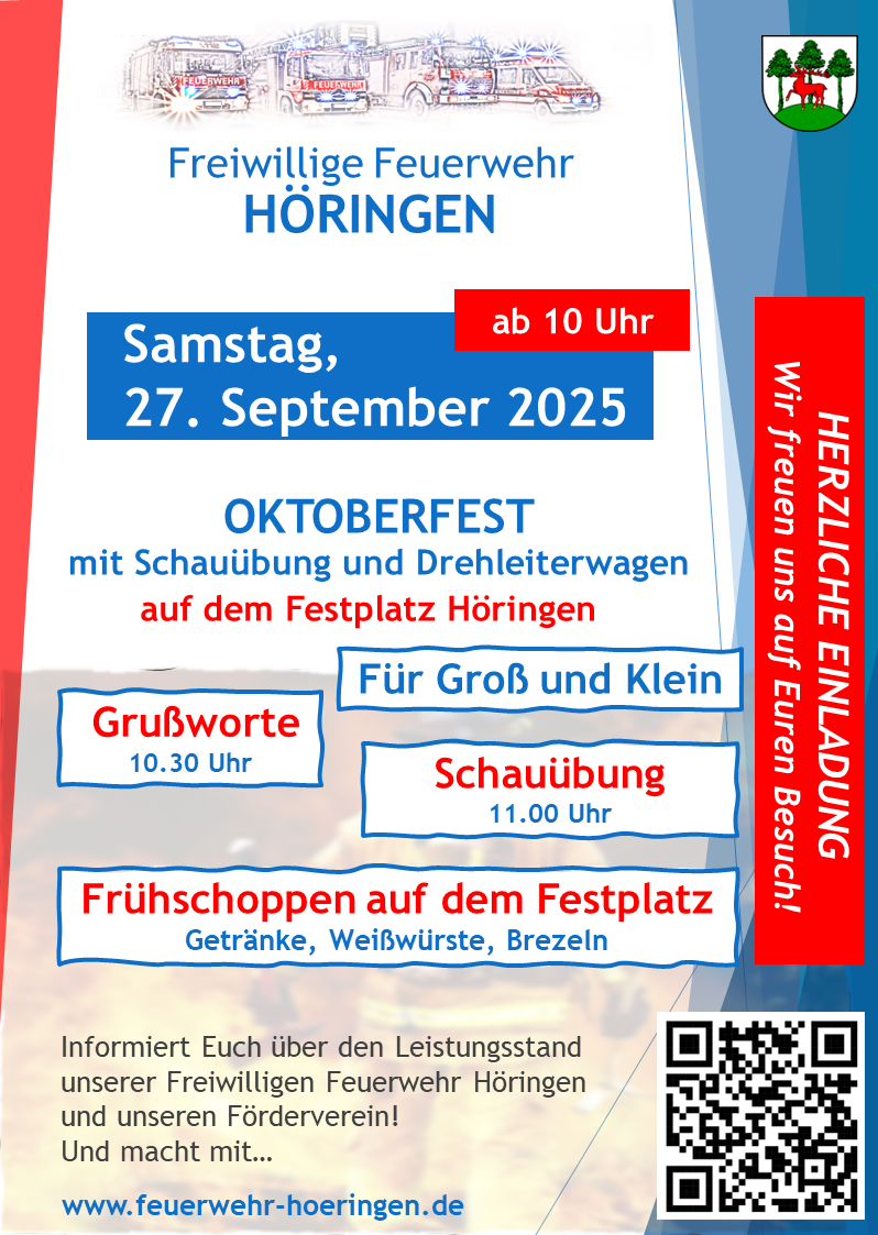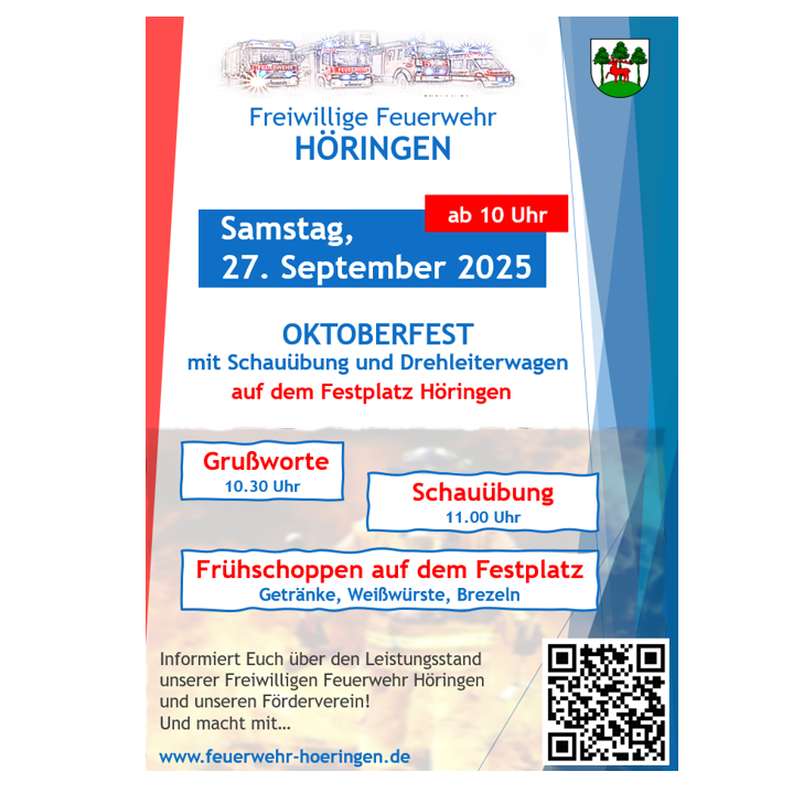 Am 27. September 2025 hat die Freiwillige Feuerwehr Höringen im Rahmen eines Oktoberfestes ihre zweite Schauübung seit der Reaktivierung der Feuerwehr Höringen durchgeführt. Nachdem im vergangenen Jahr bereits über 100 Gäste die Fähigkeiten der neuen Feuerwehr bei der Rettung einer verletzten Person aus dem ehemaligen Gasthof Bolander unter Vollatemschutz unter Beweis gestellt hat, kamen auch in diesem Jahr mehr als 100 Gäste auf den Höringer Festplatz.