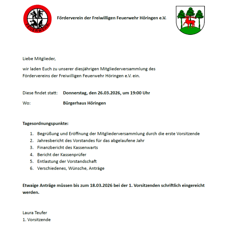 Herzliche Einladung zur Mitgliederversammlung des Fördervereins am Donnerstag, 26. März 2026, 19.00 Uhr, im Bürgerhaus Höringen. Wir freuen uns auf jede Teilnehmerin und jeden Teilnehmer zum gemeinsamen Rückblick auf das ereignisreiche Jahr 2025.