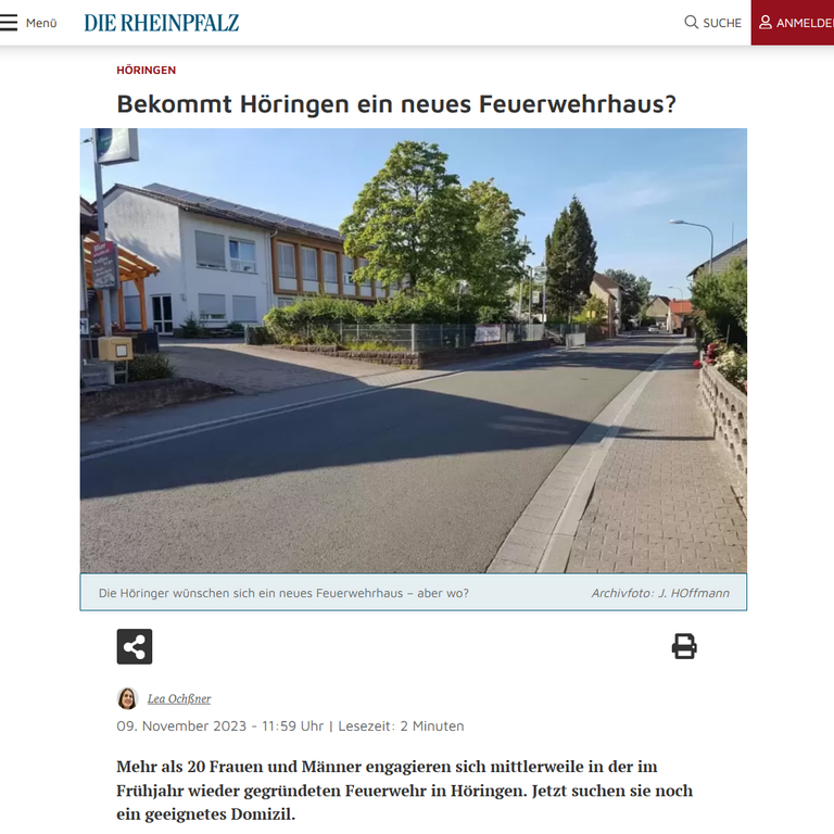 09.11.2023 - Die Rheinpfalz berichtet über die Planungen für unser neues Feuerwehrhaus in Höringen.