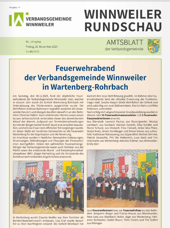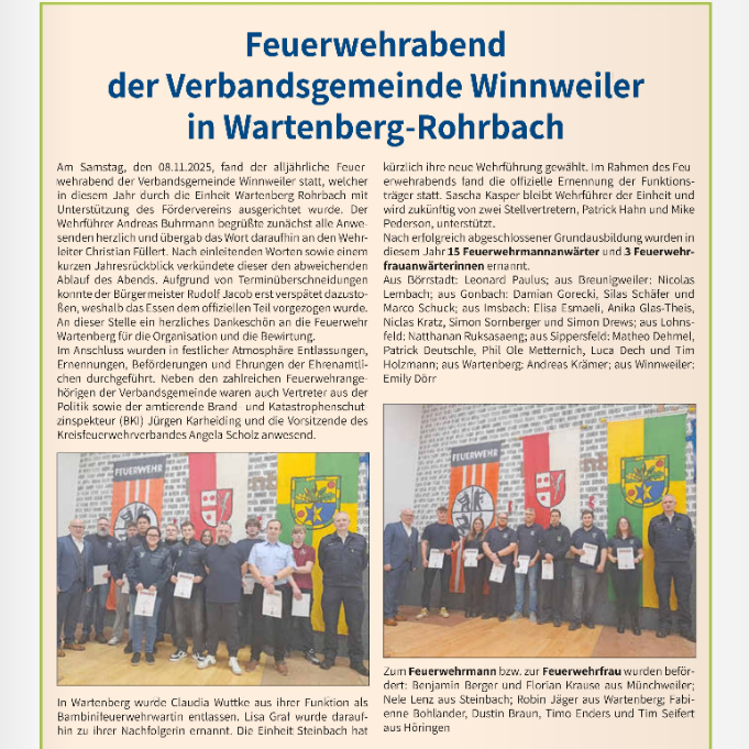 28.11.2025 - Grund zur Freude: Am Freitag, 28. November 2025, berichtet die Winnweiler Rundschau über weiter Beförderungen bei der Feuerwehr.
